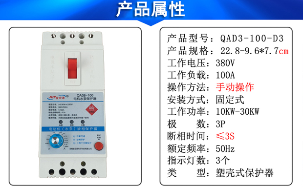 金宏源潜水泵保护器在潜水泵出现断相、缺相情况下3秒内自动切断电源,避免了潜水泵因缺相、断相而烧毁的现象的发生。其大额定电流为100A,额定电流小于100A的水泵、潜水泵、电机均可使用此款水泵保护器进行保护。此款潜水泵缺相保护器大的优势就是:可以自由调正额定功率大小,而且具有三个指示灯,随时监控水泵运行状态。